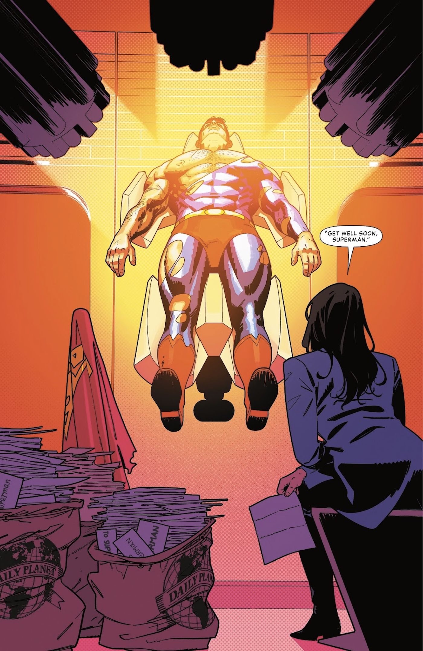 Joshua Williamson, Bruno Redondo y Adriano Lucas Superhombre (2023) #9 Comienza con Lois Lane sentada con un Superman inconsciente, leyéndole una carta de recuperación que le envió un niño llamado Jamie. El panel rápidamente se corta para revelar saco tras saco de esas cartas, todas llenas hasta el borde, mientras Lois comienza a leer otra.