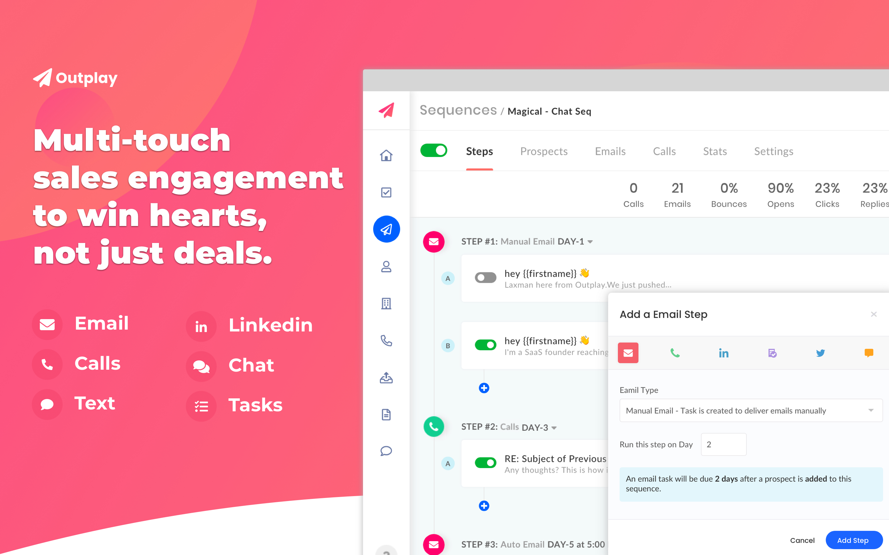 Outplay está diseñado para equipos que usan múltiples canales para llegar a clientes potenciales, incluidas llamadas telefónicas, mensajes de texto, correo electrónico, chats en vivo en sitios web y plataformas de redes sociales como LinkedIn o Twitter. Se integra con plataformas de gestión de relaciones con los clientes como Salesforce y Pipedrive, lo que brinda al personal de ventas una nueva interfaz que incluye herramientas de productividad y automatización para reducir el tiempo que dedican a tareas administrativas.