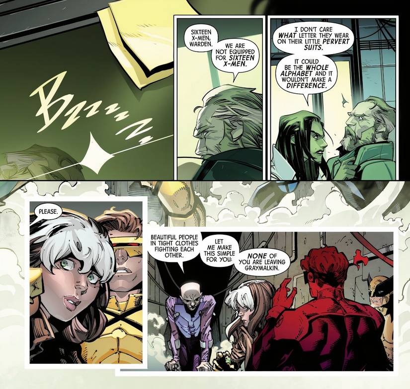 X-Men El número 9, del escritor Jed MacKay y el artista Federico Vicentini, es parte del evento cruzado “Raid on Graymalkin”, en el que participan los equipos X-Men de Cyclops y Rogue. infiltrarse en la prisión Graymalkin de la Dra. Corina Ellis para liberar a sus compañeros de equipo. En su frustración, Ellis se refiere a los disfraces de los X-Men como “pequeños trajes de pervertidos”, y luego Scurvy llama a los dos equipos “Gente hermosa con ropa ajustada”, lo que confirma aún más cuán apasionados son realmente los X-Men.