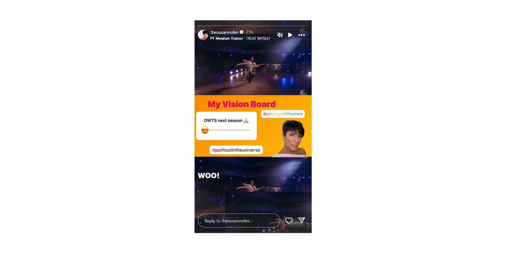 Susan también incluyó el hashtag “#putitoutintheuniverse”. Además, etiquetó DWT. Susan configuró su historia de Instagram con la canción “Treat Myself” de Meghan Trainor, y la letra aparece en la parte inferior de la pantalla.