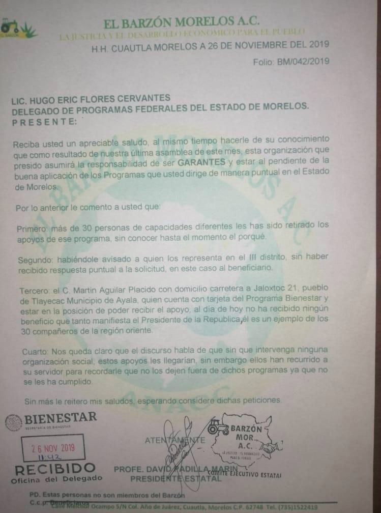 Desde el pasado 26 de noviembre, los afectados ingresaron un oficio –con número BM/04/2019- donde preguntan la razón para dejar sin apoyo a las personas con capacidades diferentes y también expresan la incongruencia de esta acción con el discurso del presidente Andrés Manuel López Obrador.