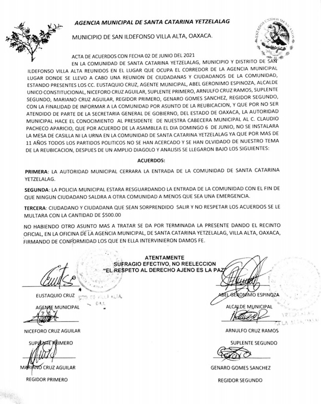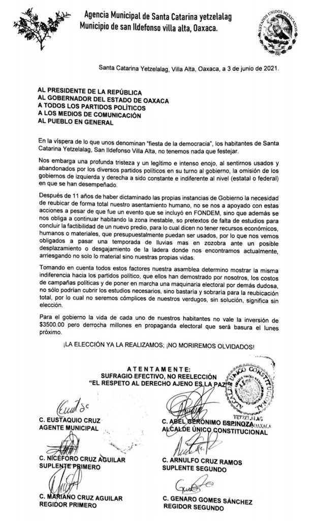 Por otra parte, habitantes del municipio oaxaqueño de Santa Catarina Yetzelalag en Villa Alta, decidieron en asamblea que no permitirán la instalación de las casillas en la jornada del próximo 6 de junio ya que no tienen “nada que festejar”.