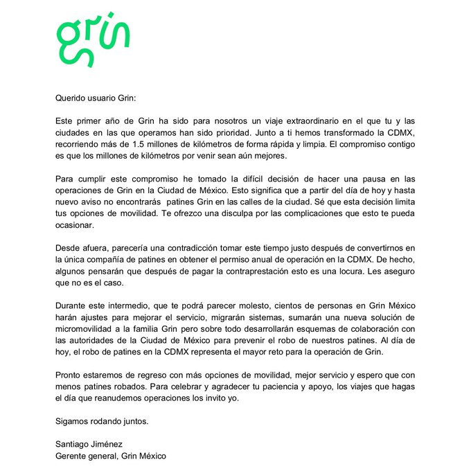 “Sé que esta decisión limita tus opciones de movilidad. Te ofrezco una disculpa por las complicaciones que esto te pueda ocasionar”, manifestó Santiago Jiménez, gerente general de Grin México.