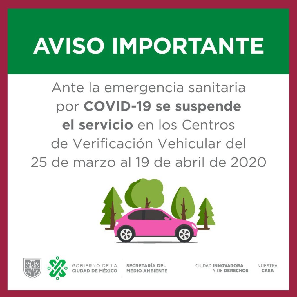 A través de la Dirección General de Calidad del Aire, indicó que las actividades que realizan los Centros de Verificación de Emisiones Contaminantes de Vehículos Automotores autorizados en la ciudad, se suspenderán del 25 de marzo al 19 de abril de 2020.