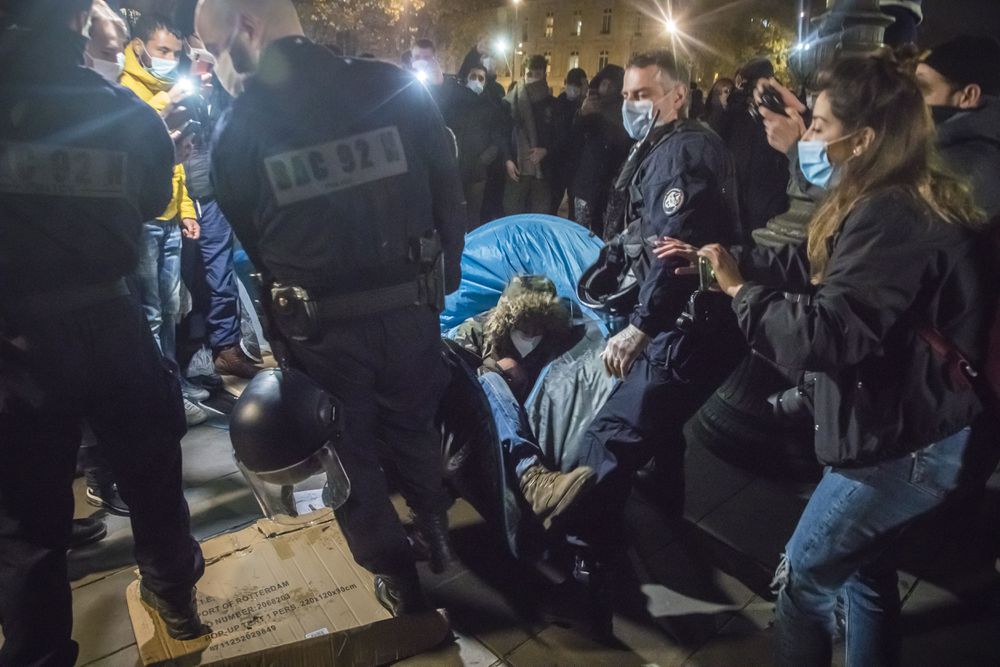 La evacuación violenta de un campamento temporal de migrantes erigido en pleno centro de París, en la noche del lunes, no ha dejado indiferente ni a los habituales críticos con los métodos de la policía francesa ni a sus defensores. Hubo gases lacrimógenos y agresiones a migrantes y periodistas. Todo, grabado por cámaras y teléfonos móviles a pocas horas de que la Asamblea Nacional aprobara este martes la polémica ley de “seguridad global” con 388 votos a favor, 104 en contra y 66 abstenciones. Una norma que limitará la difusión de imágenes de los agentes de la policía y la gendarmería. El Senado examinará el texto en enero.