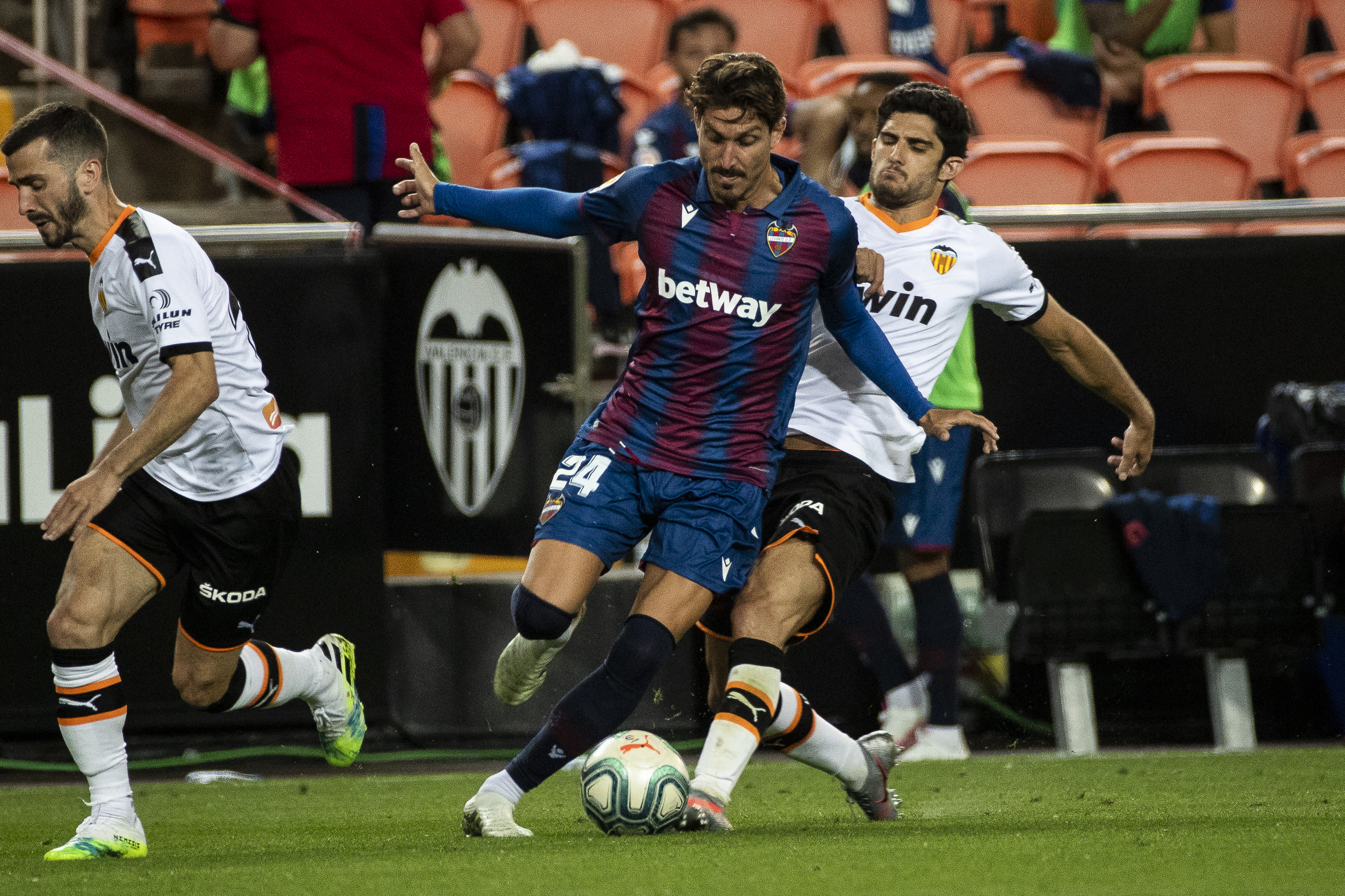 Una pérdida de Parejo en un saque de falta cerca del área provocó una situación de cuatro contra dos frente a la portería de Cillessen que marró Clerc. Acto seguido, Carlos Soler disparó a gol con el interior del pie derecho pero Aitor Fernández desvió al travesaño. Parejo, muy lento e impreciso, y muy lejos de Coquelin, perdió el control del partido pero el Levante se enredaba constantemente en la salida del balón e hinchaba sus estadísticas de errores no forzados. Su defensa adelantada y fallona, en cambio, no se llevó ningún mordisco en la primera mitad. Morales, al que el parón no le ha restado ni un ápice de velocidad, llenaba de inseguridades al dubitativo Diakhaby hasta que Paco López le dio descanso.