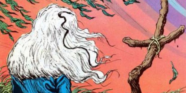 El problema encuentra a Metron, el científico-erudito de los Nuevos Dioses, navegando por los confines de la realidad y explorando los cuerpos de los gigantes celestiales congelados tan familiares para los fanáticos de la serie original de Kirby, cuando es visitado por Swamp Thing, encarnado en algunas muestras de materia vegetal que había recogido Metron. Juntos, los dos viajan a través de los confines más extraños y remotos de la existencia y se encuentran con un “aleph”, o un punto desde el que todo el tiempo y el espacio son visibles, que Veitch representa brillantemente como una enorme extensión de dos páginas con 41 pequeños paneles que muestran todo, desde partidos de fútbol hasta pterodáctilos, Adolf Hitler y el Big Bang.
