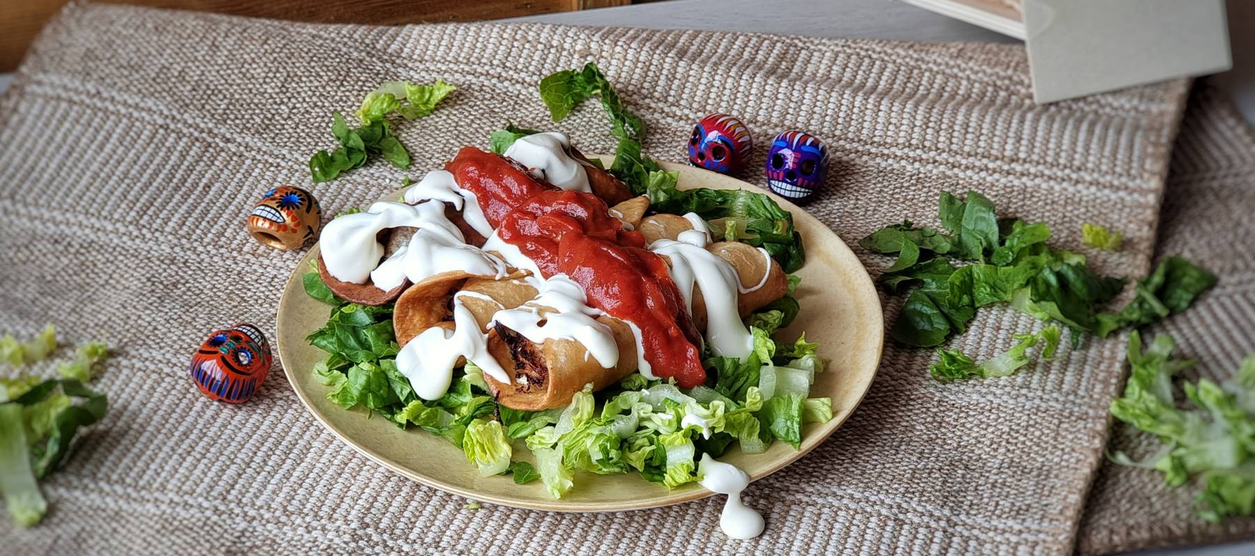 ¿Por qué se llaman dorados? Porque son tacos fritos, y la tortilla se dora en la sartén hasta quedar crujiente y deliciosa. De maíz siempre, aunque también se puede hacer con tortillas de harina -así llaman en México a las tortillas de trigo que nosotros usamos para quesadillas o fajitas-, y dentro todo lo que cada uno quiera (aunque es muy normal que vayan con pollo o también con patata y frijol). Los tacos dorados son un fantástico ejemplo de cocina de aprovechamiento: cualquier cosa que nos sobre, podemos meterla dentro de unas tortillas de maíz que se cerrarán con la ayuda de unos palillos, ¡y listo! Una vez dorados, los tacos se suelen acompañar de opciones muy diversas: aguacate en trozos o guacamole, lechuga rallada, queso rallado o batido, pico de gallo, salsa verde, salsa roja, salsa de frijol… Si conocéis las flautas, es esto mismo.