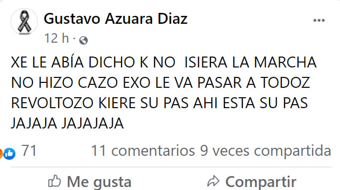 Previamente, en la cuenta del activista apareció un mensaje que señalaba: “Se le había dicho que no hiciera la marcha. No hizo caso. Eso le va a pasar a todos los revoltosos. ¿Quiere su paz? Ahí está su paz, jajajaja”.