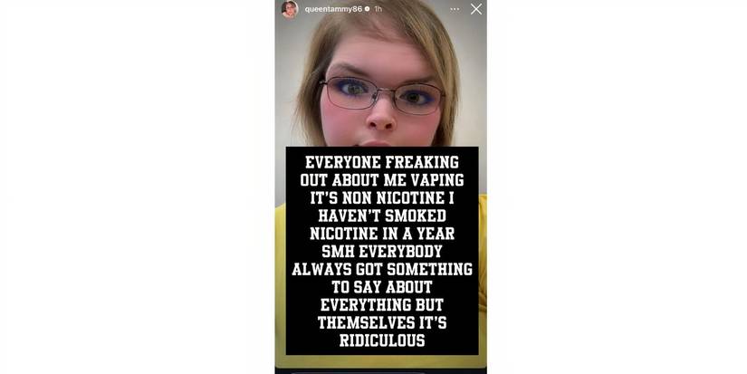 Tammy Usé sus historias de Instagram para abordar los rumores de que había comenzado a vapear nuevamente. Publicó una selfie con glamour completo y un nuevo peinado con su cabello rubio separado a un lado. Sin embargo, Tammy no quería que el enfoque estuviera en su nueva cara delgada. Agregó una pared de texto sobre la selfie donde escribió: “Todos los que se enloquecen de mí vapeando, no es nicotina. ” Tammy agregó que no ha fumado en un año.SMH Todos siempre tienen algo que decir sobre todo menos ellos mismos.“Ella criticó a sus críticos por ser ridículo.