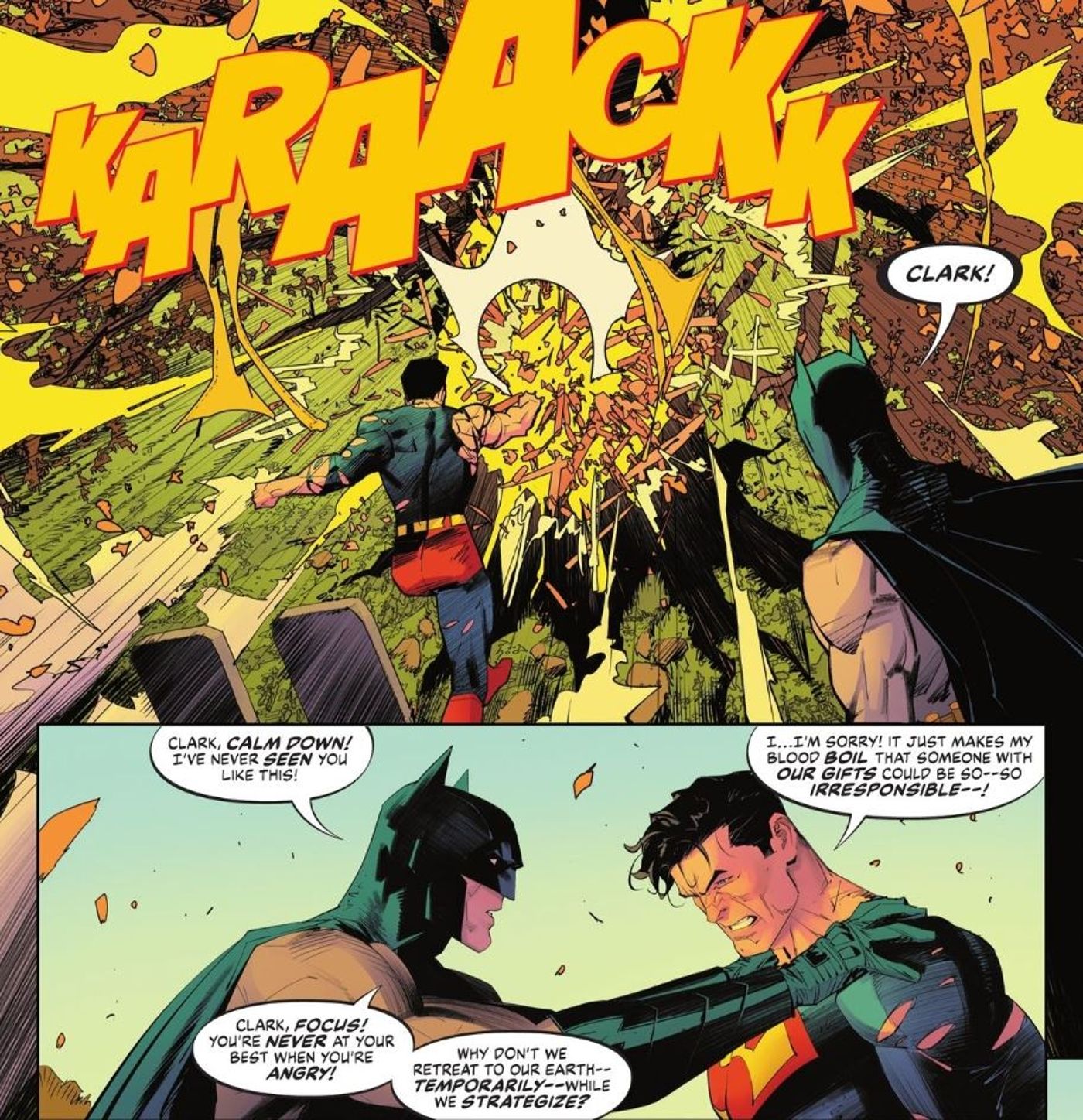 “/> Después de que Superman se escapa de su contraparte, lleva a Batman a la granja Kent para que puedan descubrir qué está pasando. Pero Clark está indignado por lo que acaba de ver y golpea un árbol, haciéndolo pedazos. Batman le implora a su amigo que se calme, pero Superman se sorprende de que alguien con sus poderes pueda ser tan imprudente.