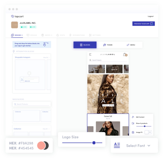 Esta estrecha integración con Shopify ayuda a Tapcart porque no tiene que centrarse en la infraestructura de comercio electrónico, ya que la forma en que se estructuran las cosas en torno al inventario y las colecciones es aproximadamente un 90% igual en todas las marcas. En cambio, Tapcart se enfoca en el 10% que hace que las marcas se destaquen unas de otras, lo que incluye cosas como la marca, el contenido y el diseño. Su CMS permite a los comerciantes crear contenido exclusivo, cambiar los colores y las fuentes, agregar videos y más para que la aplicación se vea y se sienta completamente personalizada.