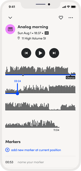 La aplicación también ha sido diseñada para que sea más fácil volver a la parte correcta de las grabaciones, gracias a sus formas de onda inteligentes, además de los marcadores y fotos opcionales. Y puede marcar grabaciones como favoritas para que pueda obtener rápidamente una lista de sus mejores ideas y sonidos. La aplicación también ofrece una integración completa del centro de medios, por lo que puede reproducir su música cuando tenga tiempo.
