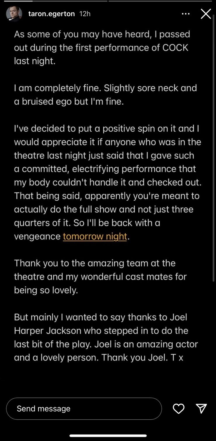 La estrella de Kingsman, Taron Egerton, colapsa en medio de su nueva obra, Cock, en una situación en la que se actuó rápidamente, poniendo al actor a salvo.