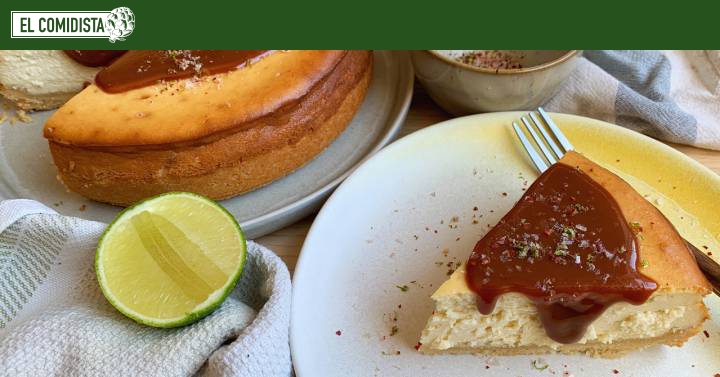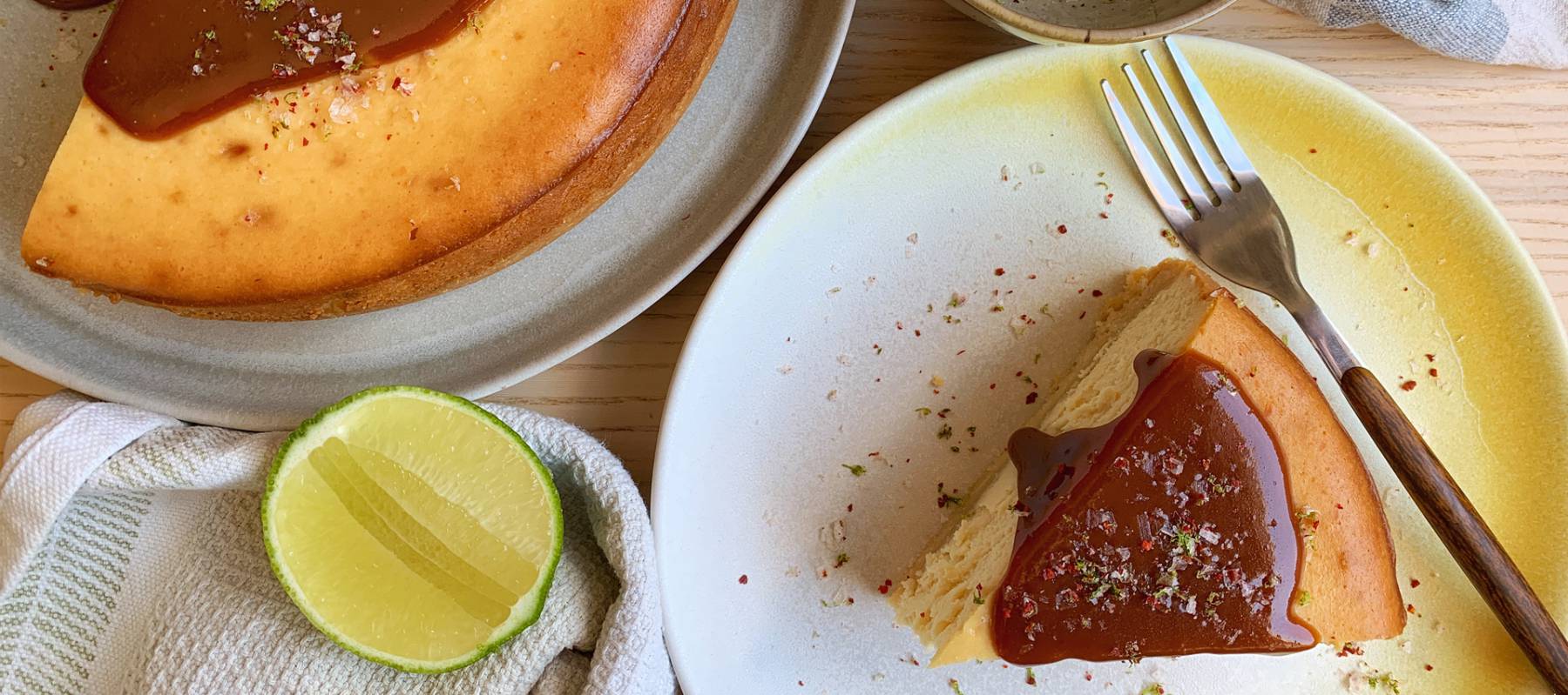 9. Servir la tarta con el caramelo por encima y, si se quiere, con escamas de sal, chile en copos y ralladura de limón o naranja.