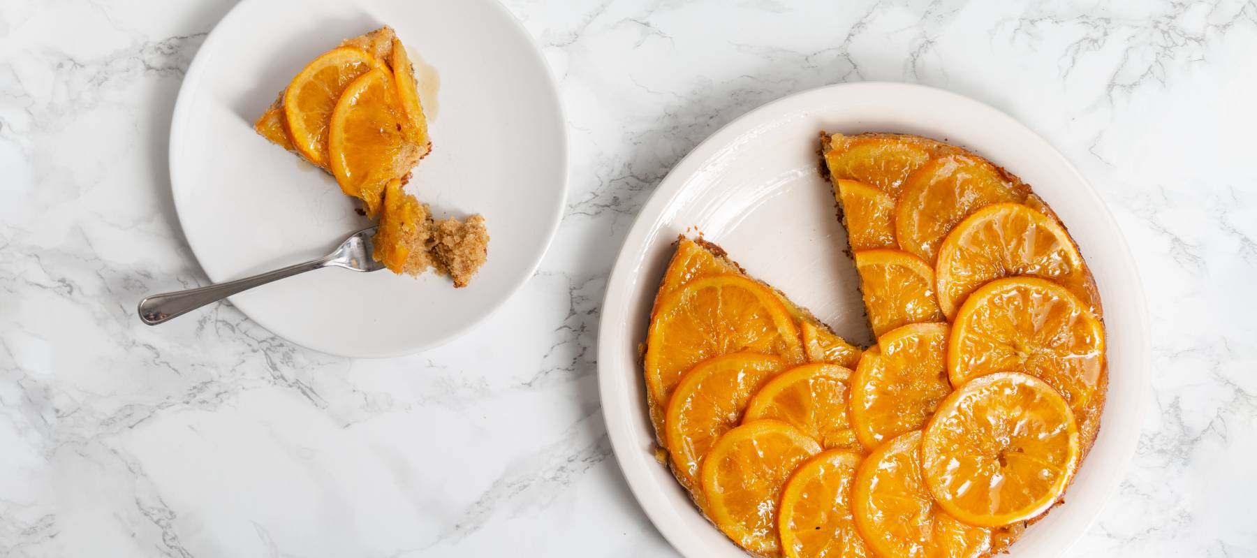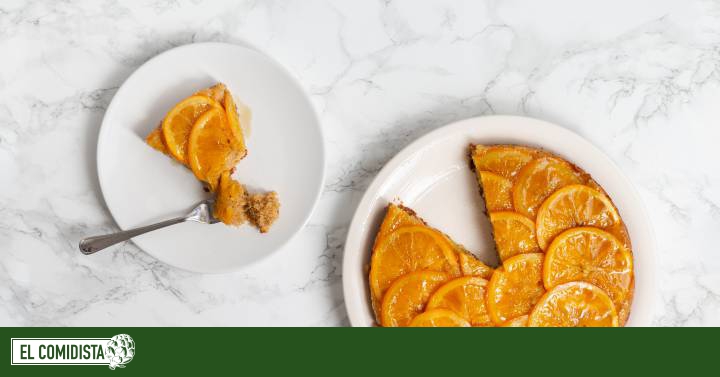 Mantengo mi postura firmemente -y sé que no soy la única en este club- pero he dado con una receta donde la naranja confitada no solo no me disgusta sino que me agrada bastante. Se trata de esta tarta especiada invertida: un suave bizcocho con especias con una capa fina de naranjas confitadas en almíbar con cardamomo por encima. Esta tarta no se cocina así como la ven sino al revés, con la naranja debajo y el bizcocho encima, y se da vuelta en el desmoldado. De ahí, obviamente, lo de invertida.