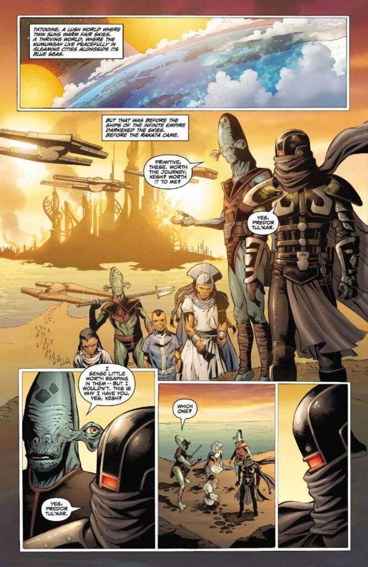 Ambientada 26.000 años antes de la trilogía original, El amanecer de los Jedi representaba un Tatooine brillante y vibrante que se parecía a la Tierra. Antes de que los océanos se secaran, el planeta estaba envuelto en azul y verde con agua y selvas tropicales. En este punto, no era el pozo negro de la villanía en el que eventualmente se convertiría con la presencia de los hutts y los cazarrecompensas. Si bien el planeta aún estaba sano, fue invadido por Rakata, que contribuyó a una sequía y utilizó sus recursos naturales lo suficiente para cambiar el clima. “Tatooine, un mundo exuberante donde soles gemelos calientan cielos claros. Un mundo próspero, donde los Kumumgah viven pacíficamente en ciudades relucientes a lo largo de sus mares azules “.