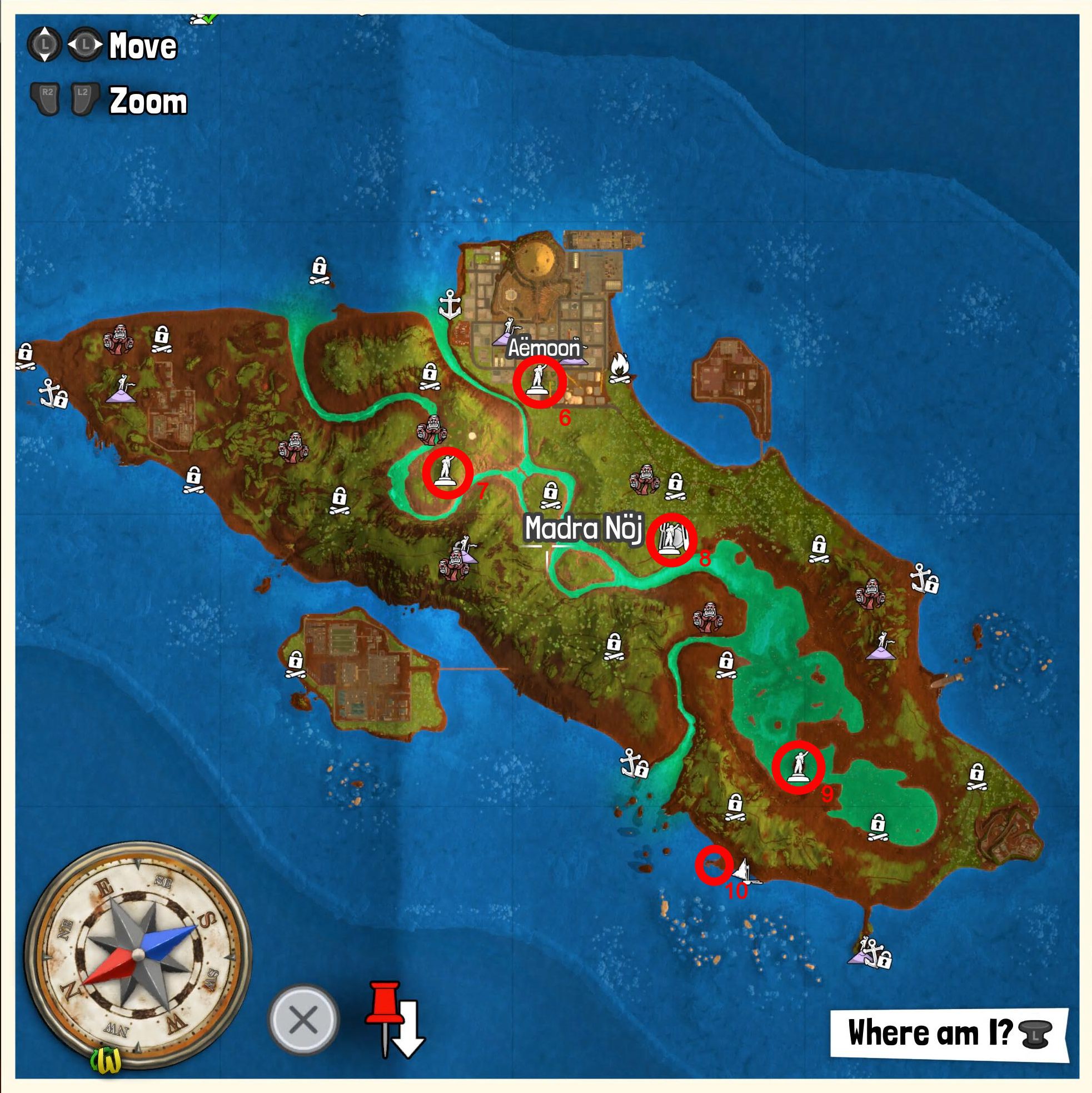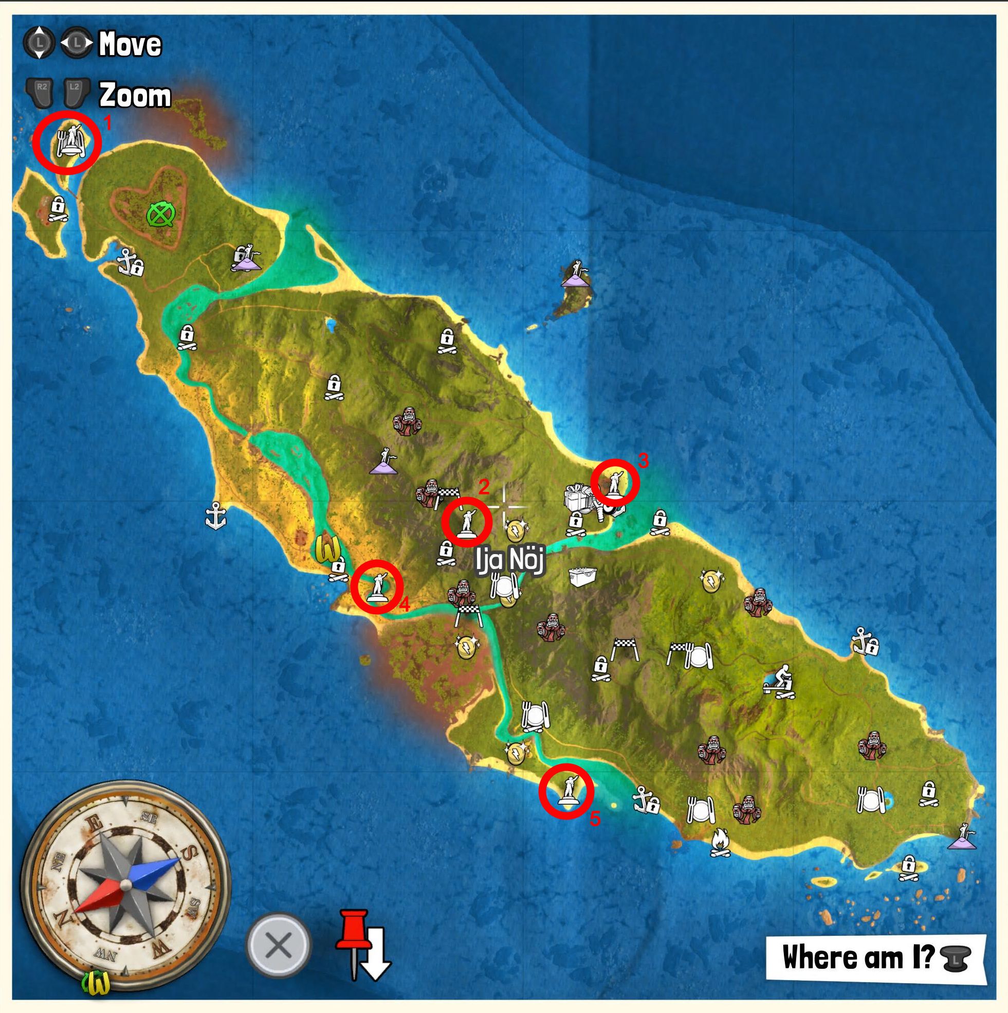 Las diez estatuas de Meavora se pueden encontrar en las ubicaciones marcadas en el mapa de arriba. Hay cinco en Ija Nöj y cinco en Madra Nöj: una división equitativa entre las dos islas. Para destruir las estatuas de Meavora, los jugadores deben usar elementos explosivos como lámparas de aceite o huevos de gallina explosivos.
