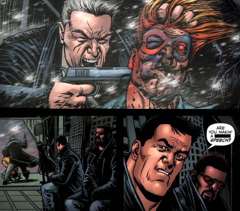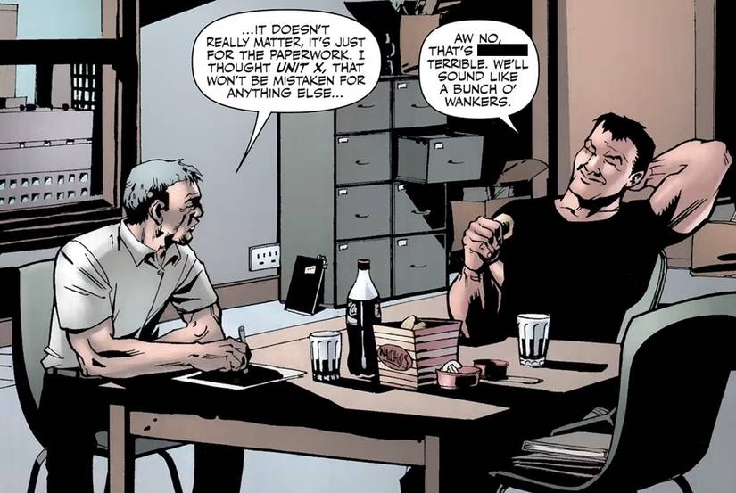 En cambio, Butcher sugiere ‘The Boys’ como una referencia a un término utilizado por los gánsteres del Reino Unido para referirse eufemísticamente a sus ejecutores, un término que deja claro que está a punto de realizarse una violencia inmensa, pero también implica que es un hecho cotidiano. En última instancia, leo este momento cuando Mallory sugiere que la Unidad X puede ser una fuerza significativa para frenar los excesos de Supe, una organización que pertenece al mismo mundo que los equipos de héroes con nombre en código, y Butcher acepta la realidad de que The Boys tratará de imponer violencia que en realidad no cambiará mucho de nada (por esoButcher tiene sus propios planes oscuros.)
