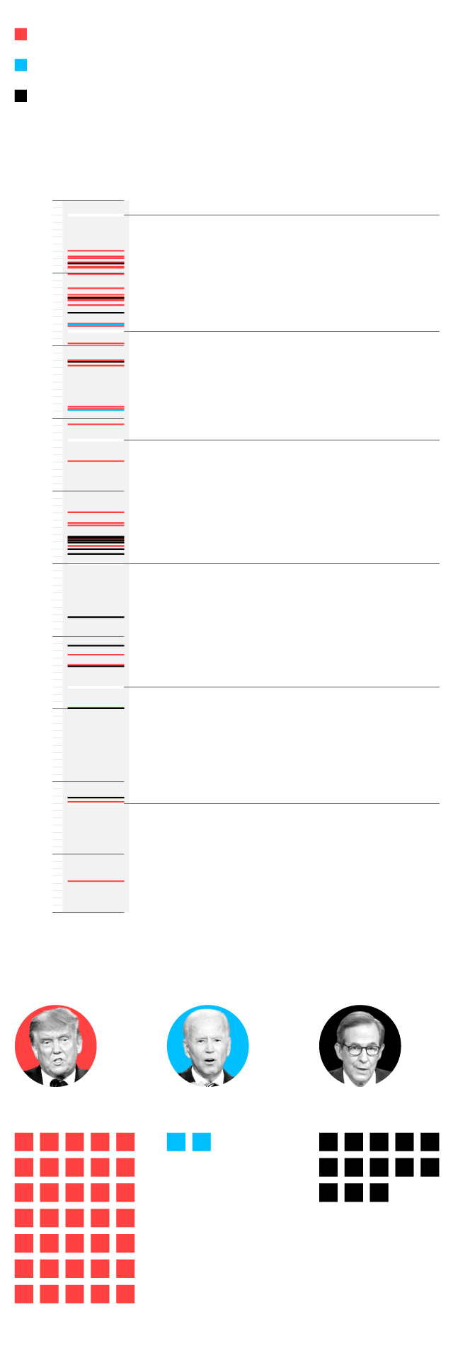 En el primer bloque Trump interrumpió a Biden en 15 ocasiones, Chris Wallace llamó la atención a Trump tres veces y Biden interrumpió una vez a Trump.