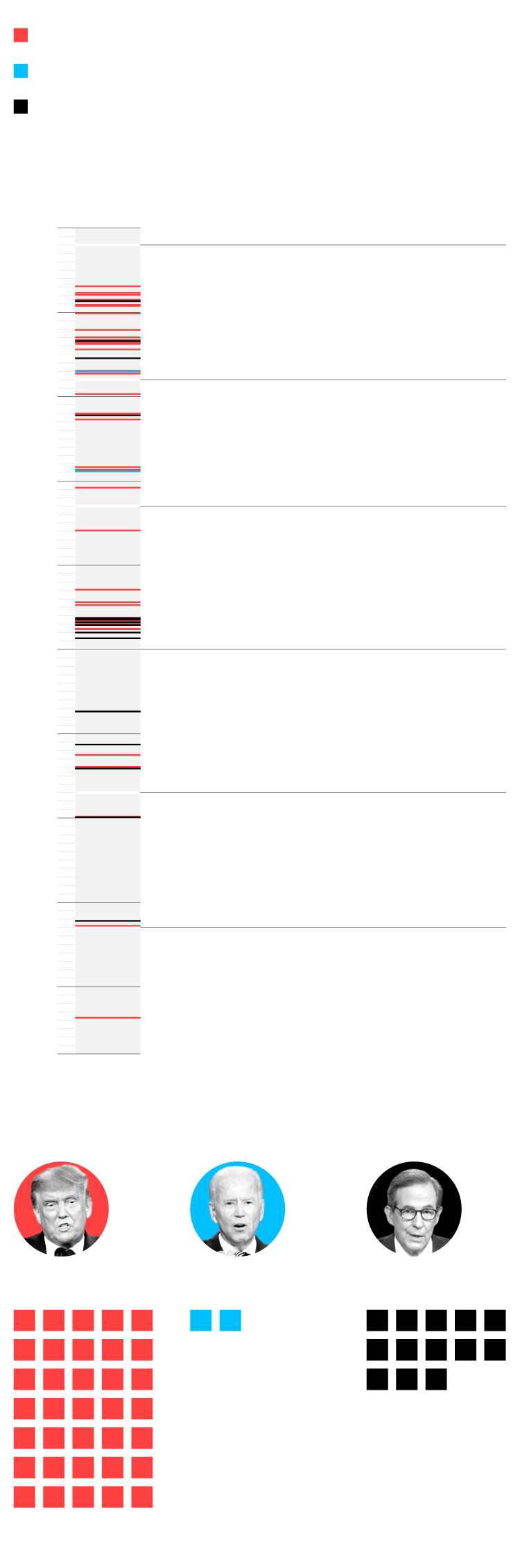 En el primer bloque Trump interrumpió a Biden en 15 ocasiones, Chris Wallace llamó la atención a Trump tres veces y Biden interrumpió una vez a Trump.