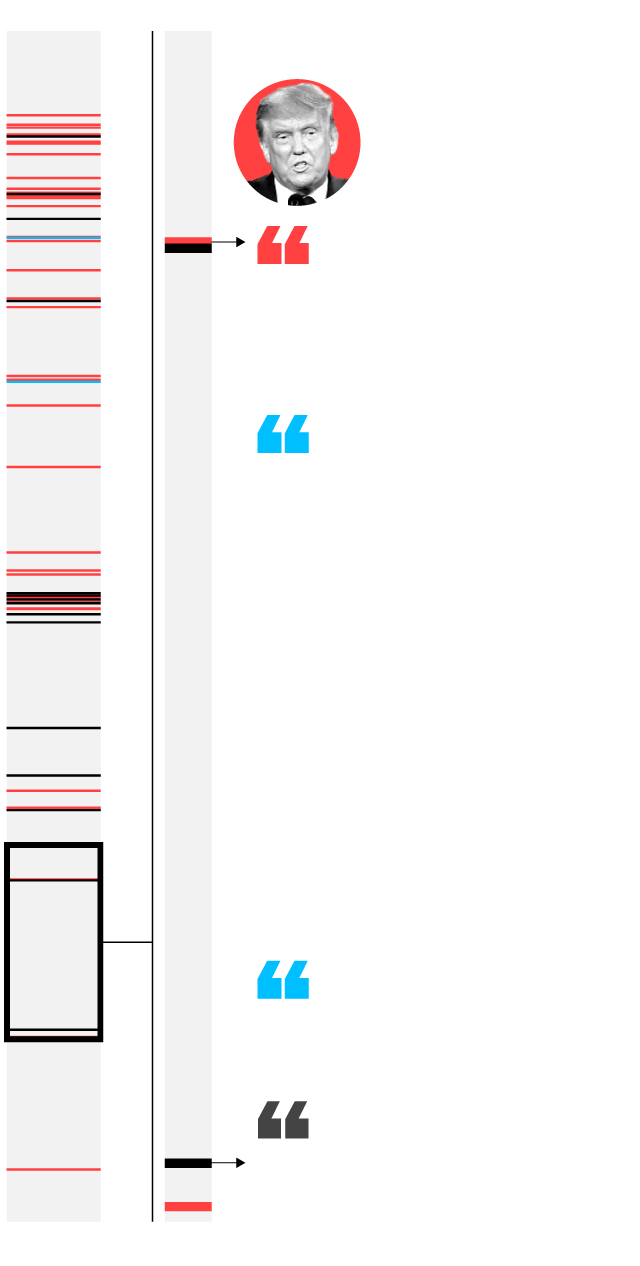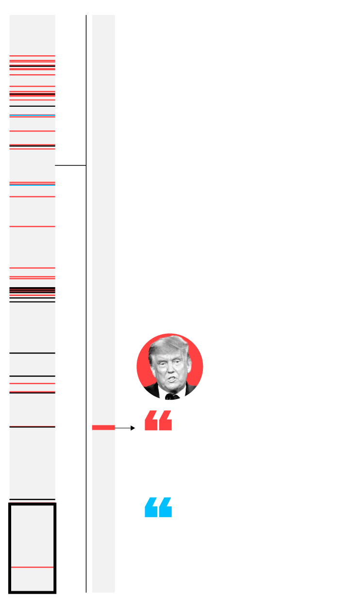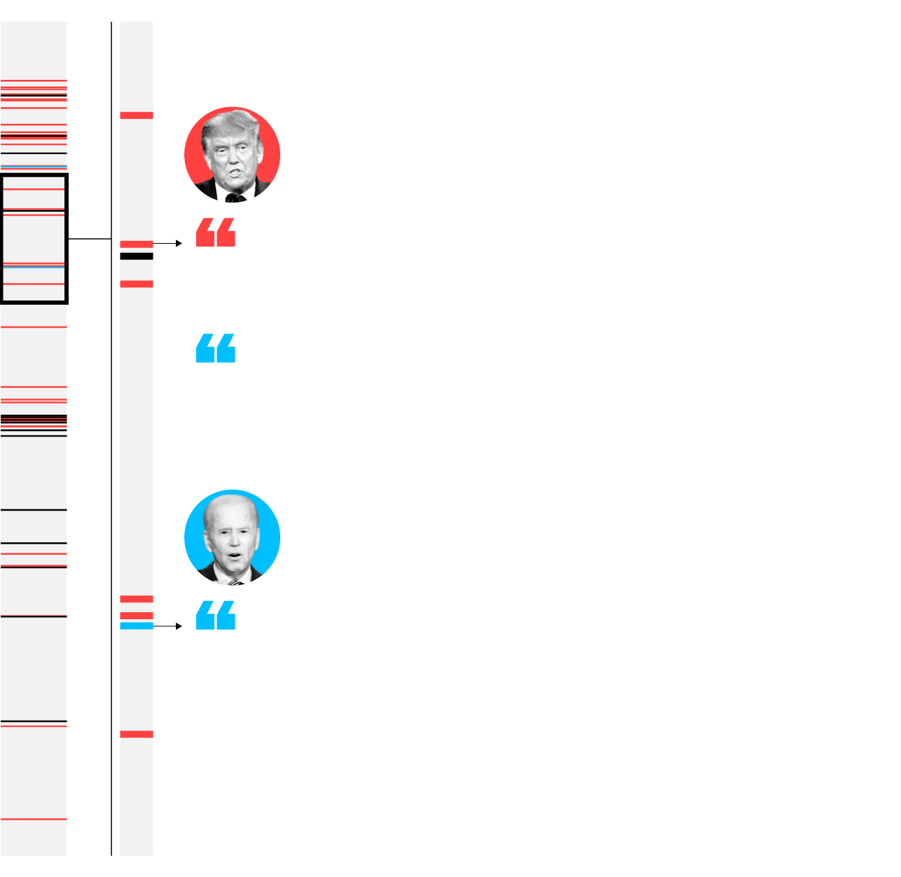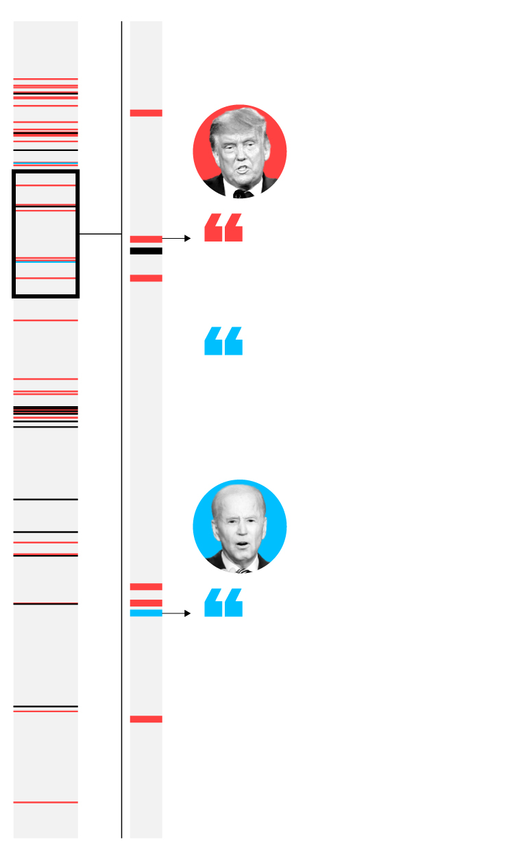 Tras las seis llamadas al orden del bloque anterior, Trump relajó un poco el tono y solo interrumpió al candidato demócrata en dos ocasiones. El moderador le llamó la atención dos veces, además de una vez a Biden y otra a ambos.