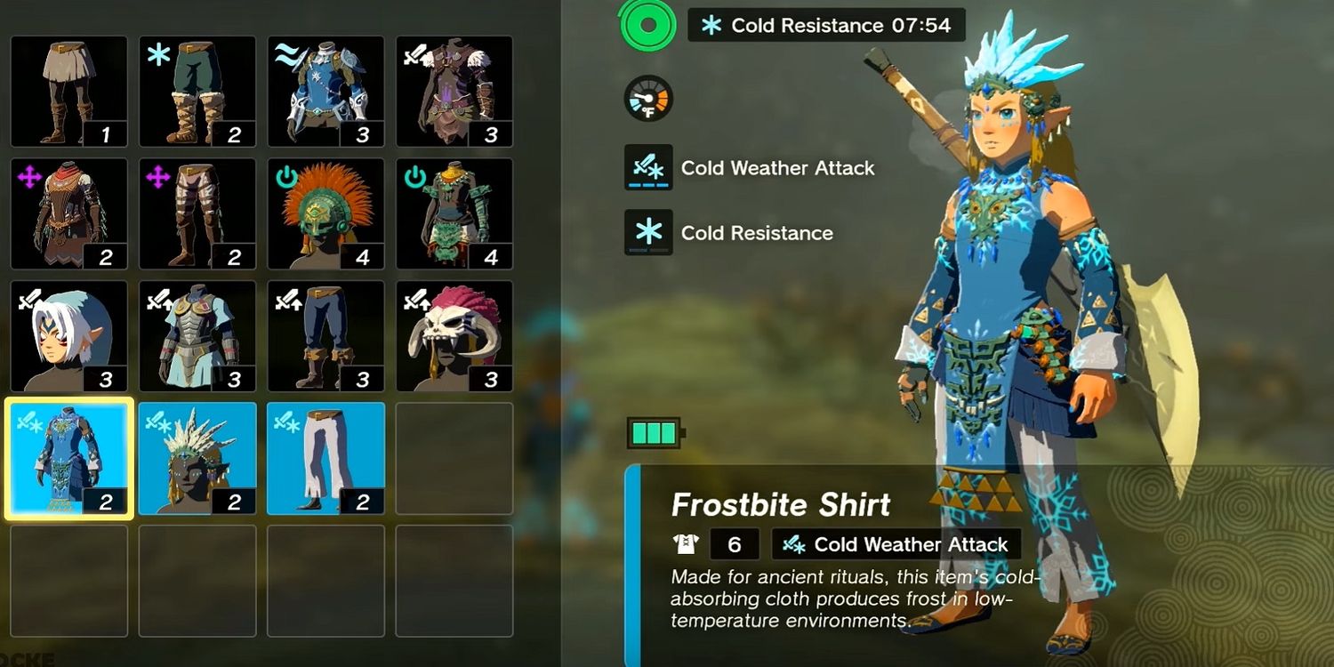 El Frostbite Set es otro similar a los Charged y Ember Sets, creando un trío temático en TOTK. El diseño del conjunto Frostbite es el más simple de los tres conjuntos, pero el tocado y las mangas detallados no hacen que parezca que le faltan decoraciones. En general, este conjunto tiene una sensación casi elegante y combina bien con el mundo de TOTK.