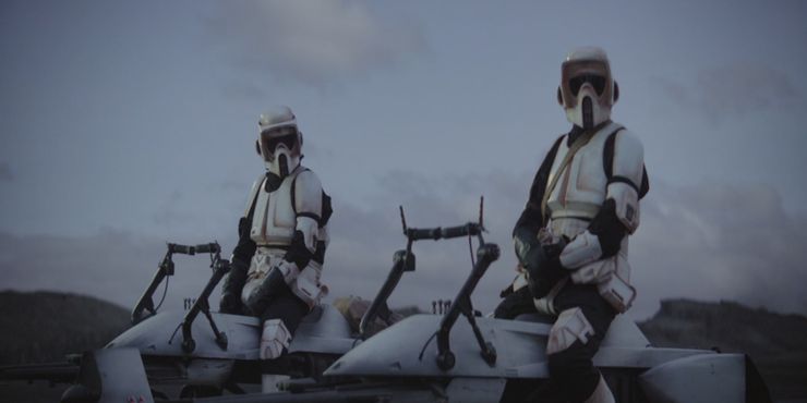 El suyo es un cameo hilarante junto a Bike Scout Trooper # 2 (interpretado por Adam Pally) mientras capturan a The Child y se involucran en un humor consciente de sí mismos sobre el mal objetivo de los Stormtroopers. Este último también termina golpeando a The Child. Más tarde, el droide IG-11 viene al rescate y ataca brutalmente a los dos.