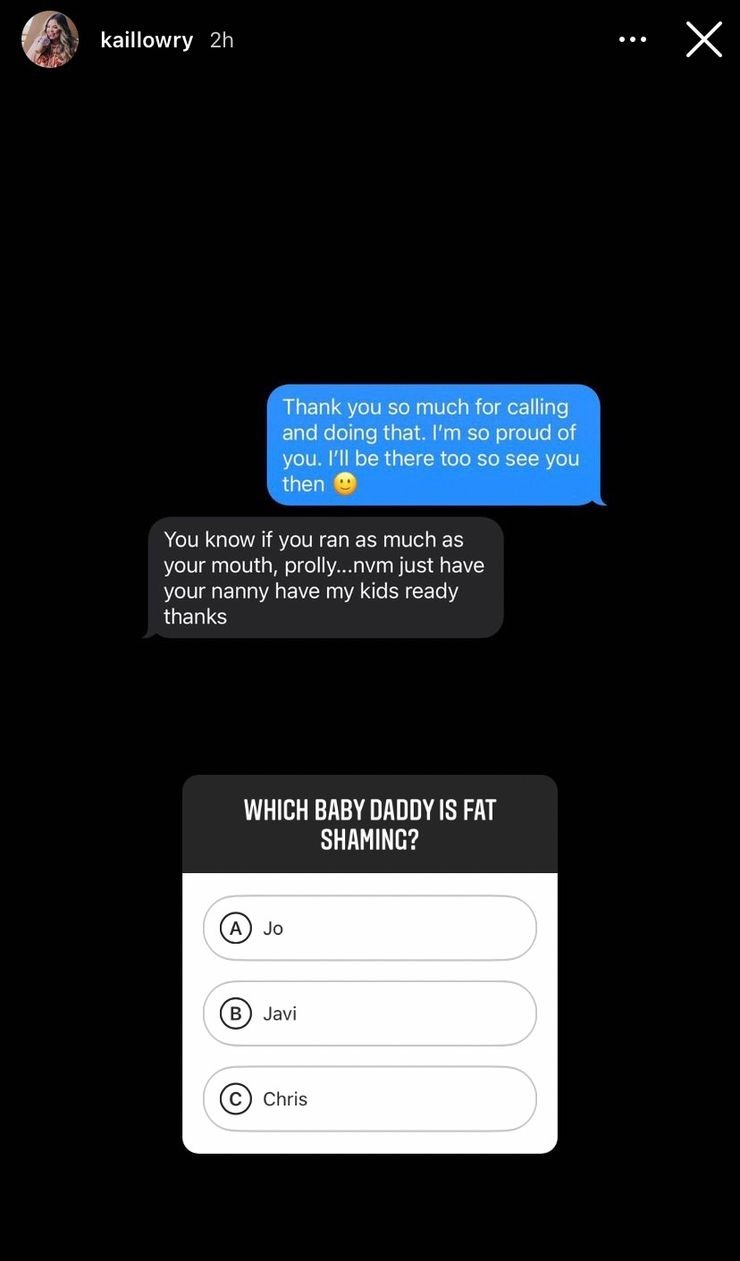 Kailyn utilizó su IG Story para publicar una captura de pantalla de un intercambio de iMessage. “¿Qué papi está gordo avergonzando??“Kailyn escribió sobre la captura de pantalla, proporcionando tres opciones con Chris como la respuesta correcta. La captura de pantalla solo reveló dos mensajes, comenzando con un texto que envió la estrella de MTV”.Muchas gracias por llamar y hacer eso ” Kailyn escribió. “Estoy tan orgulloso de ti. Yo también estaré allí para verte “. Chris respondió con un comentario sarcástico aludiendo al peso de Kailyn. “Sabes que si corriste tanto como tu boca, probablemente … nvm solo haz que tu niñera tenga a mis hijos listos gracias “. Chris respondió.