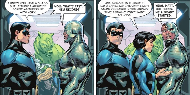 Incluso los momentos en los que los estudiantes apenas están presentes tienen una cualidad más triste para ellos, como durante la conversación entre Nightwing y Cyborg. En la escena, Nightwing intenta expresar su frustración a Cyborg por su relación con Starfire y cómo ella está celosa de que salga con Barbara Gordon mientras está en Bludhaven. Pero, dado que Cyborg actualmente está dando una clase, los estudiantes los interrumpen constantemente porque han olvidado ciertos elementos en varios lugares y necesitan permiso para irse. Después de que cada estudiante se va, los dos maestros no pueden evitar discutirlos por unos momentos y una vez que finalmente regresan al tema original de discusión, son interrumpidos una vez más por otro estudiante.