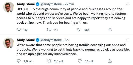 Andy Stone, responsable de comunicación de Facebook, lanzó este mensaje: “ACTUALIZACIÓN: A la gran comunidad de personas y empresas de todo el mundo que dependen de nosotros: lo sentimos. Hemos estado trabajando arduamente para restablecer el acceso a nuestras aplicaciones y servicios y nos complace informar que ahora están volviendo a estar en línea. Gracias por soportarnos”.