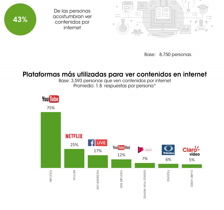 En lo que se refiere a televisión por internet, la encuesta muestra que la gente prefiere plataformas como YouTube y Netflix, con 25% y 17% de menciones. Le sigue Facebook Live, con 12%, Youtube Red, con 7%; Google Play, con 6%, y Televisa al fondo, con 6%.