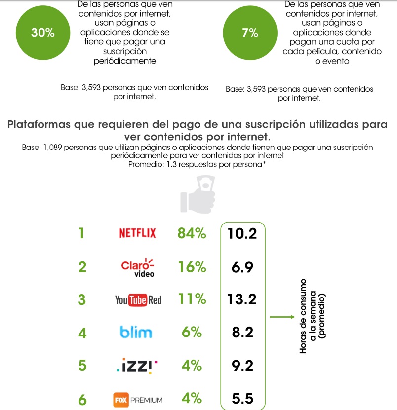 De acuerdo con la Primera Encuesta 2019, Usuarios de Servicios de Telecomunicaciones, del IFT, sobre el uso de los servicios de video que se transmiten sobre plataformas de internet, conocidos como Over The Top, 30% de los usuarios tiene una cuenta y consideran que la principal ventaja de los mismos consiste en ver películas o series de estreno.