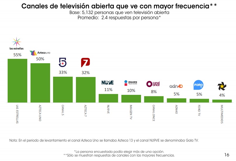 En tanto, la Encuesta Nacional de Consumo de Contenidos Audiovisuales 2017, realizada también por el Instituto Federal de Telecomunicaciones (IFT), apunta que -en el caso de la televisión abierta- el canal de Las Estrellas es la señal favorita de las personas, con 55% de menciones, por encima de Azteca Uno, su principal competidor, con 50%.