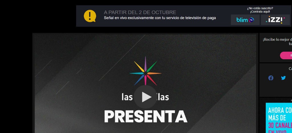 En la parte superior del reproductor de video de la señal en vivo ya aparece el anuncio: A partir del 2 de octubre. Señal en vivo exclusivamente con tu servicio de televisión de paga. A un lado se observan los logotipos de Blim TV e Izzi, servicios en los que sí se vería este canal.