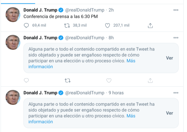 En redes sociales, Twitter ha bloqueado dos publicaciones realizadas el jueves por el presidente Donald Trump en su cuenta personal @realDonaldTrump, argumentando que alguna parte del mensaje o todo el contenido compartido “había sido objetado y puede ser engañoso respecto de cómo participar en una elección u otro proceso cívico”.