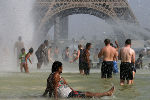 Personas refrescándose en la fuentes del Trocadero frente a la Torre Eiffel para soportar oleada de calor.