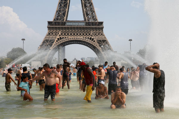 Personas refrescándose en la fuentes del Trocadero frente a la Torre Eiffel para soportar oleada de calor.