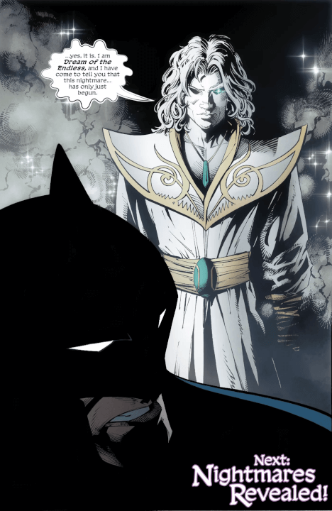 “El titular Sandman. Señor de los sueños y guardián del reino de los sueños. Finales de los 20 / principios de los 30. Fantasmal, delgado como un raíl. Debido a que los sueños son la inspiración para toda la vida y la creación, Morfeo considera que gobernarlos es una gran responsabilidad. Es un ser honorable y con principios, pero puede ser un poco obsesivo con sus deberes y es despiadado cuando no le agrada. La obsesión de los sueños puede dejarlo fuera de contacto con la humanidad, ya que ve a los seres humanos como meros motores de sueños. Un dios arrogante que eventualmente se entera de que debe cambiar o morir “.