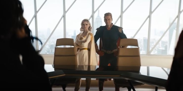 El liderazgo de Homelander’s Seven aparentemente se ve desafiado en Los chicos temporada 3 – y desafiado con éxito. Un breve tráiler muestra a Homelander de pie junto a Starlight en una conferencia de prensa. No hay diálogo, pero ambos héroes están colocados detrás de sillas adyacentes en la cabecera de la mesa de los Siete. En temporadas pasadas, este escritorio en forma de V venía acompañado de un único asiento para Homelander en la cabecera, mientras que los otros seis héroes se sentaban alineados en cada pata de la “V”. Las sillas dobles de Homelander y Starlight en Los chicosEl avance de la temporada 3 implica fuertemente que ahora son líderes conjuntos de los Siete, y la conferencia de prensa del clip debe haber sido organizada para marcar ese anuncio trascendental.