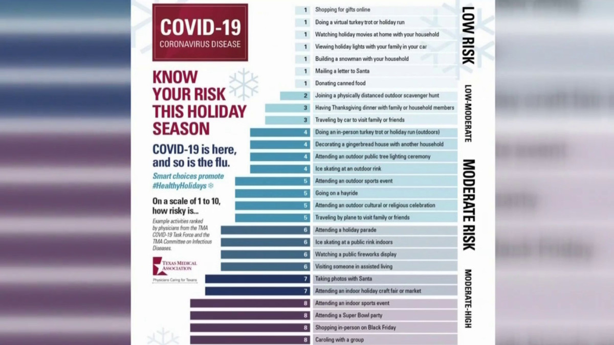 SAN ANTONIO – Ante la llegada de la temporada de fiestas de fin de año, la Asociación Médica de Texas publicó una lista de las actividades que pueden ponerte en mayor riesgo de contraer la enfermedad de COVID-19.