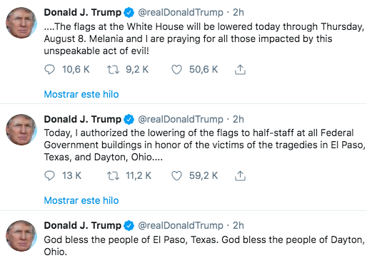 Previamente, a través de su cuenta de Twitter, Trump autorizó colocar las banderas a media asta en todos los edificios del gobierno federal en honor a las víctimas de las tragedias de El Paso y Dayton hasta el próximo jueves.