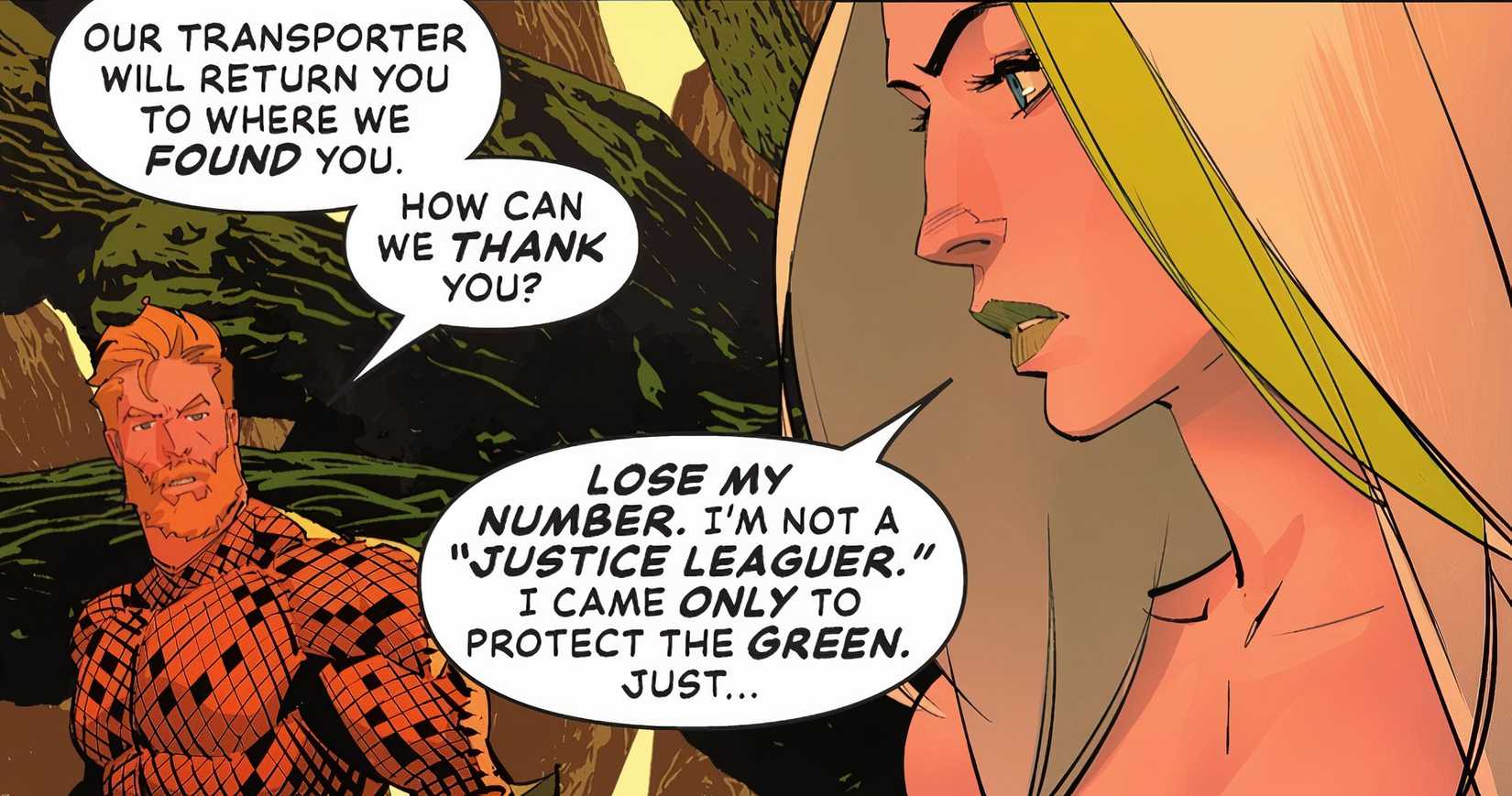 Sin embargo, Tefé todavía está imbuido de magia y lo usa para llamar al parlamento de los árboles. Los elementales del verde atacan al miembro de Inferno, permitiendo que Holanda y Aquaman liberen a Levi. Tefé se acerca y comparte la magia prestada a Levi, quien comienza a restaurar el daño al Amazonas. A medida que los miembros de la liga regresan a la torre de vigilancia para informar de esta misión, Aquaman se registra con Tefé. Holanda le dice a la Liga de la Justicia que pierda su número y que solo se unió a esta pelea para proteger el verde.