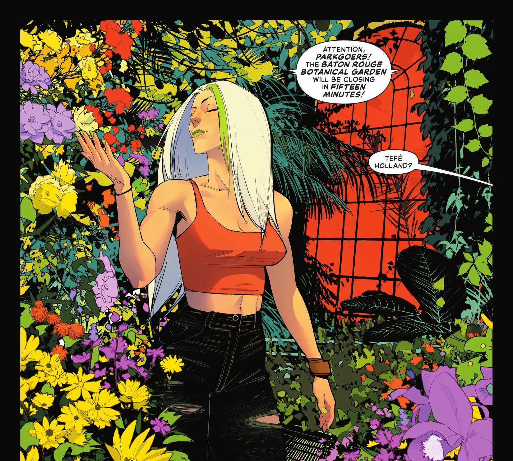 En Justice League Unlimited #4 Por Mark Waid, Dan Mora, Tamra Bonvillain y Ariana Maher, Levi Kamei, The Swamp Thing, acaban de ser incinerado por Inferno. Mister Ferrific hace que el Jardín Botánico Baton Rouge reclute a Tefé Holland, la hija de Alec Holland (el antiguo Swamp Thing), en la Liga de la Justicia. Holland rechaza la oferta, pero con Kamei se ha ido, Holanda es la mayor conexión del mundo con el verde. Tefé es llevado a la selva amazónica y Sus poderes naturales son mejorados por varios usuarios mágicos, como Constantine y Zatanna.