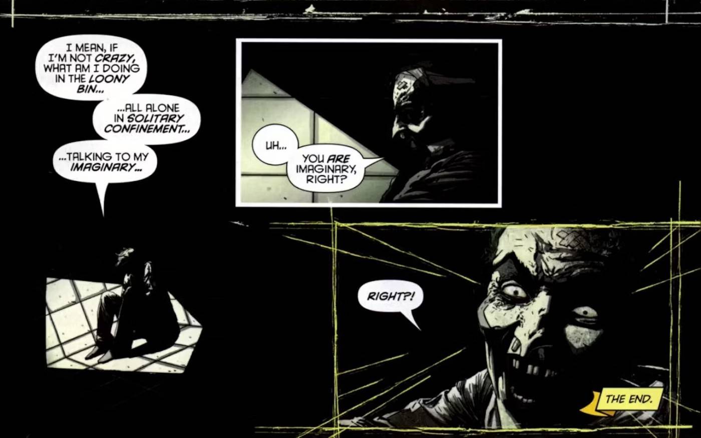 Durante un interrogatorio con un médico que intentaba encontrar la raíz de la locura del Joker, el Joker afirma que tiene “fanáticos imaginarios” mirándolo y que no todos están aquí por Batman. Más tarde, da a entender que es consciente de que los lectores lo miran mientras está en su celda, incluso se pregunta si en realidad son imaginarios o no.