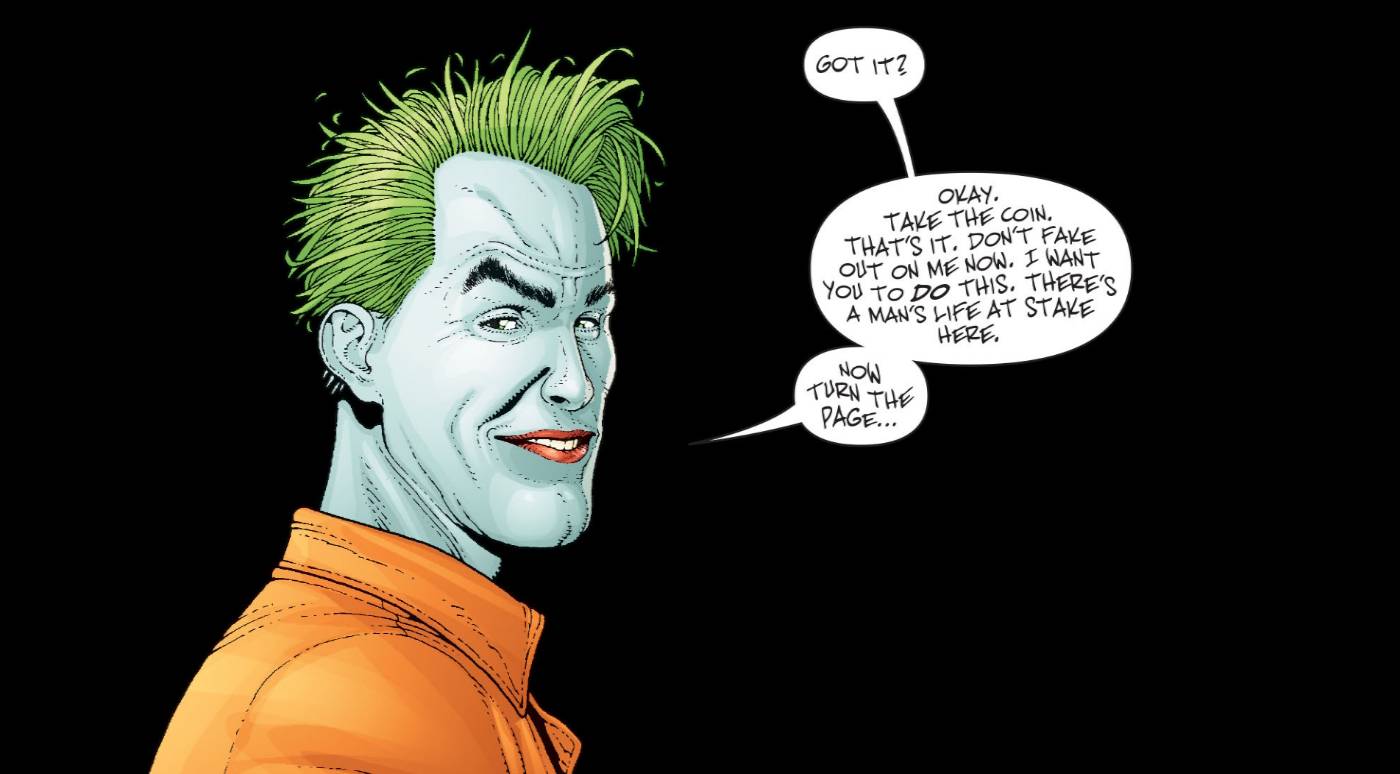 -   El Joker es consciente de que los lectores de cómics lo están observando y hacen referencia a ”