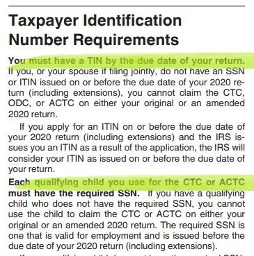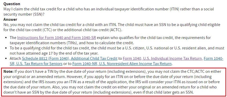 Si bien la directriz del Crédito Tributario por Hijos extendido, que se pagaría a partir de julio, es bastante nueva y no hay información detallada aún, el IRS señala en su hoja informativa de 2020 que los contribuyentes con ITIN pueden reclamar el Crédito Fiscal por Hijos (CTC) y el Crédito Fiscal Adicional por Hijos (ACTC).