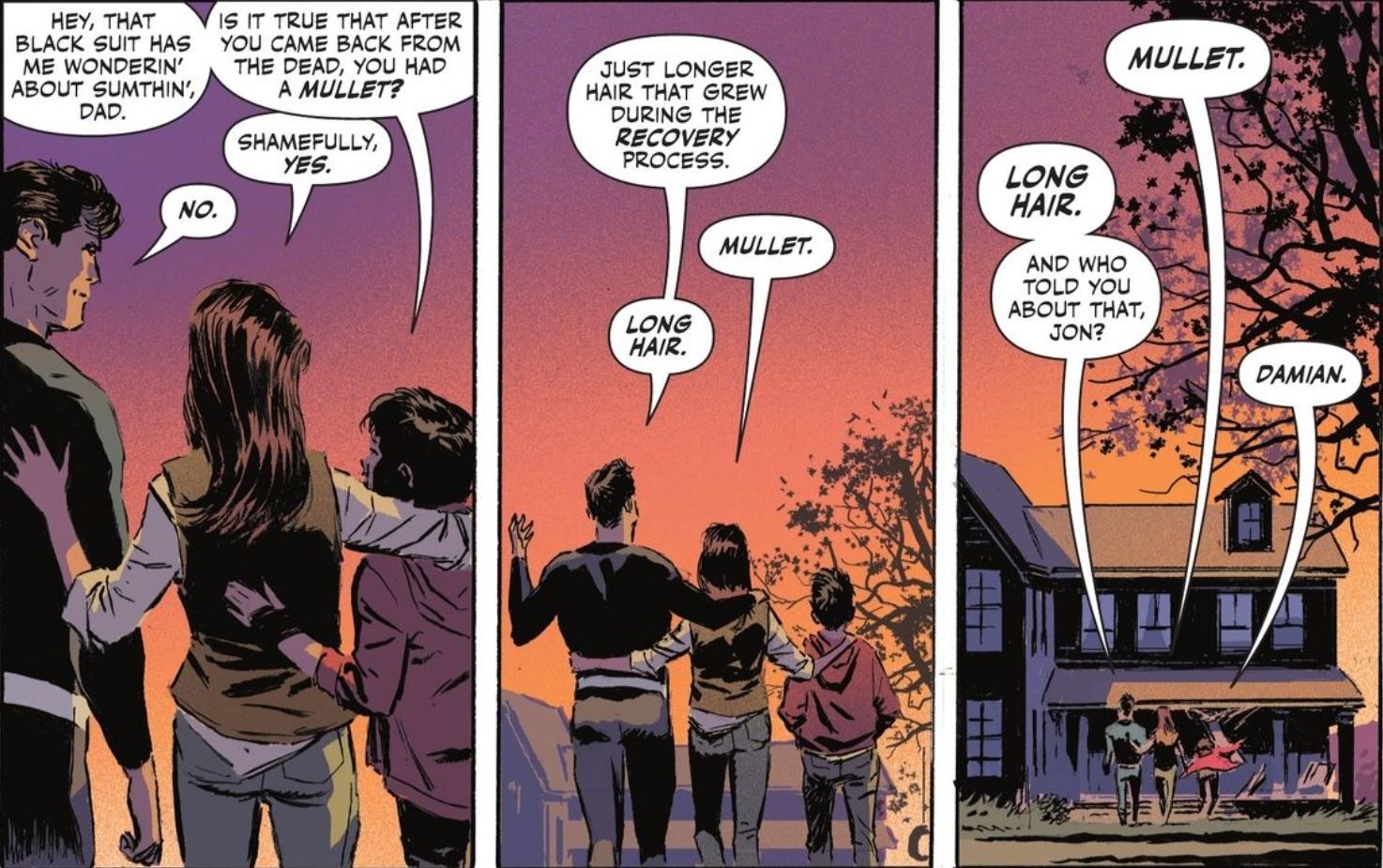 Superman y Jon regresan a Smallville y se reencuentran con Lois Lane. La familia regresa a casa para desayunar cuando Jon plantea una pregunta sobre el pasado de su padre. Jon pregunta si Superman alguna vez tuvo un salmonete, a lo que Lois responde que sí. Clark no está de acuerdo y dice que fue solo pelo largo el que creció durante el proceso de recuperación después de su batalla con Doomsday. Lois insiste en que era un salmonete antes de que Clark termine la conversación de una vez por todas diciendo que era pelo largo y nada más.