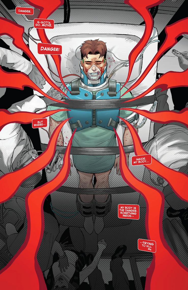 Eso no impide que Peter se prepare para acabar con los U-Foes, una banda de pícaros con poderes basados en la radiación. Una explosión masiva causada por el villano X-Ray solo causa daños menores al traje blindado contra la radiación de Ben Reilly, pero el traje de Peter no es de alta tecnología y se derrumba. Pasa la mayor parte del número siguiente en una cama de hospital con la tía May y Mary Jane a su lado, pero su sentido de la araña se vuelve loco y le dice que huya … de su propio cuerpo.