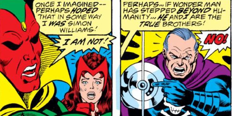 Vision es uno de varios Vengadores que suspiraron por Scarlet Witch en Marvel Comics. Otro fue Wonder Man, un personaje que tenía una conexión interesante con su esposo. Después de que Wonder Man murió salvando a los Vengadores a principios de la década de 1960, Iron Man copió en secreto sus patrones cerebrales, con la esperanza de poder usarlos algún día para devolverle la vida a Simon. Sin que él lo supiera, fueron robados por Ultrón, quien los usó junto con el cuerpo androide de la Antorcha Humana original para crear Visión. Muchos interpretaron esta impactante revelación en el sentido de que Vision era en realidad Wonder Man renacido.